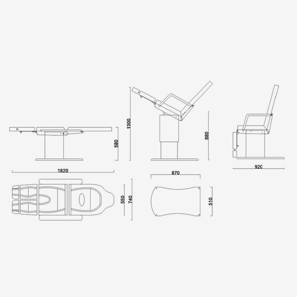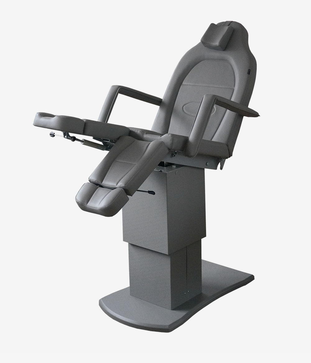 Педикюрное кресло оснащено двумя электромоторами, обеспечивающими регулировку высоты и угла наклона сиденья. Опоры для ног фиксируются при помощи газ-лифтов. Кресло легко раскладывается в горизонтальное положение, образуя ровную поверхность. Надежная конструкция системы подъема обеспечивает высокую устойчивость кресла даже при максимальной высоте. Управляется при помощи ручного проводного пульта. Дополнительно при производстве могут быть установлены различные опции.