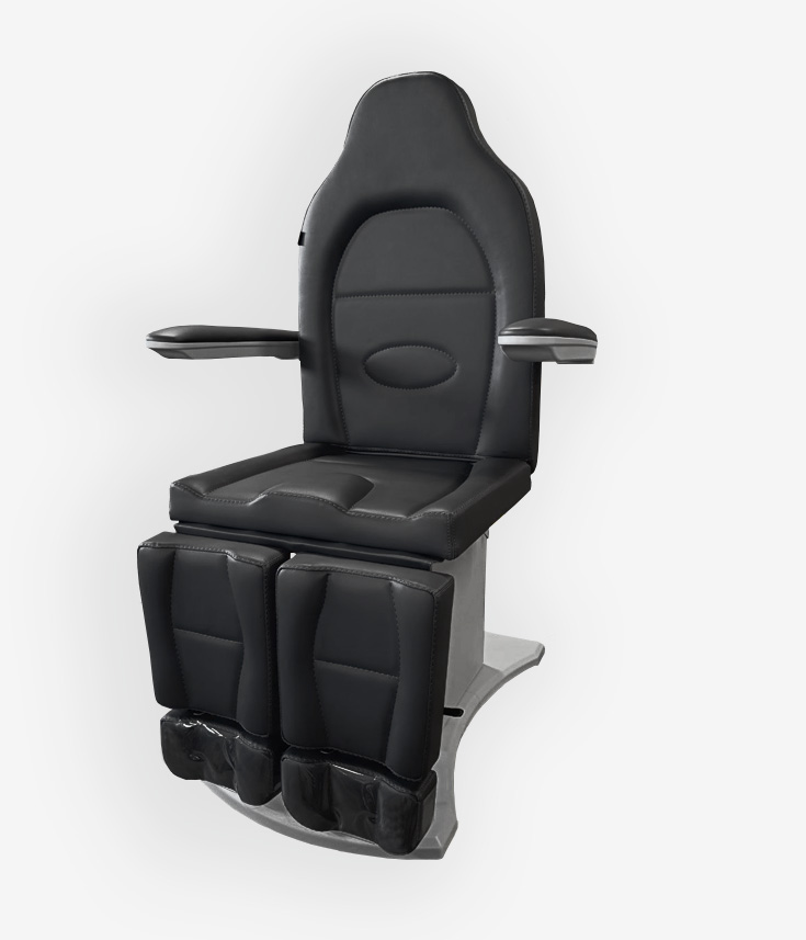 Педикюрное кресло оснащено двумя электромоторами, обеспечивающими регулировку высоты и угла наклона сиденья. Опоры для ног фиксируются при помощи газ-лифтов. Кресло легко раскладывается в горизонтальное положение, образуя ровную поверхность. Надежная конструкция системы подъема обеспечивает высокую устойчивость кресла даже при максимальной высоте. Управляется при помощи ручного проводного пульта. Дополнительно при производстве могут быть установлены различные опции.