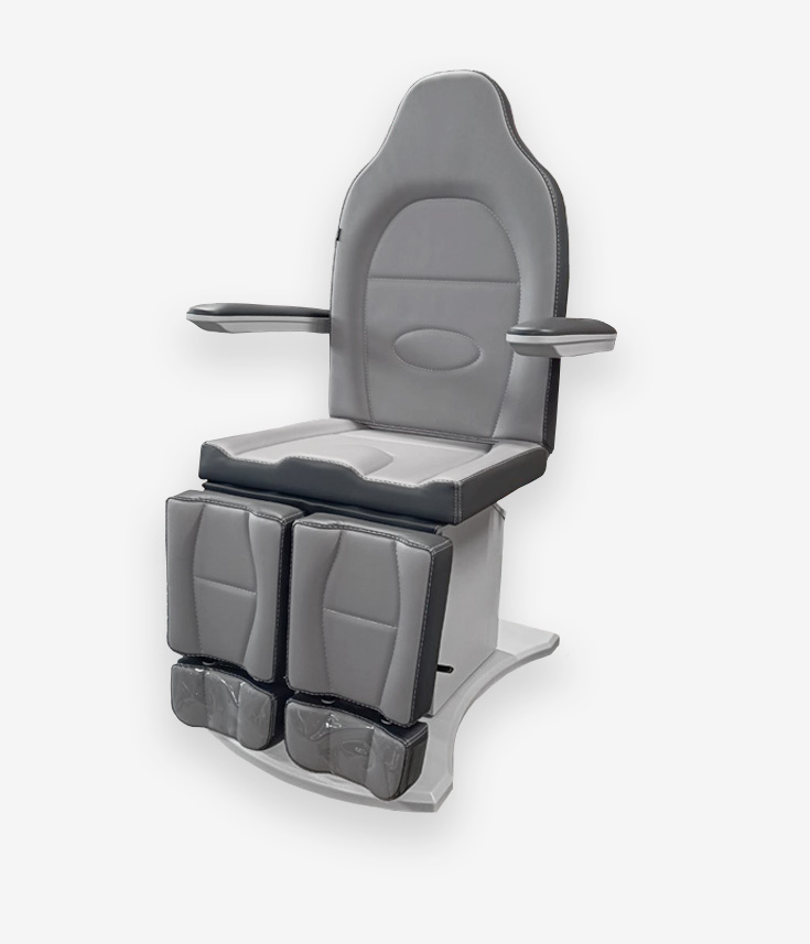 Педикюрное кресло оснащено тремя электромоторами, обеспечивающими регулировку высоты, угла наклона спинки и угла наклона сиденья. Опоры для ног фиксируются при помощи газ-лифтов. Кресло легко раскладывается в горизонтальное положение, образуя ровную поверхность. Надежная конструкция системы подъема обеспечивает высокую устойчивость кресла даже при максимальной высоте. Управляется при помощи ручного проводного пульта. Дополнительно при производстве могут быть установлены различные опции.