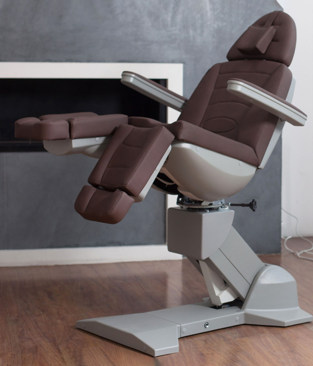 Педикюрное кресло оснащено тремя электромоторами, обеспечивающими регулировку высоты, угла наклона спинки и угла наклона сиденья. Опоры для ног фиксируются при помощи газ-лифтов. Кресло легко раскладывается в горизонтальное положение, образуя ровную поверхность. Надежная конструкция системы подъема обеспечивает высокую устойчивость кресла даже при максимальной высоте. Откидывающиеся подлокотники делают более удобным процесс посадки клиента. Управляется при помощи ручного проводного пульта. Дополнительно при производстве могут быть установлены различные опции.