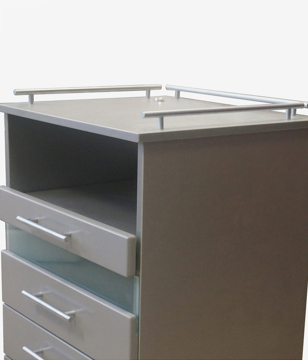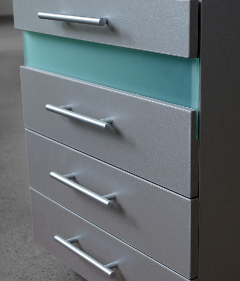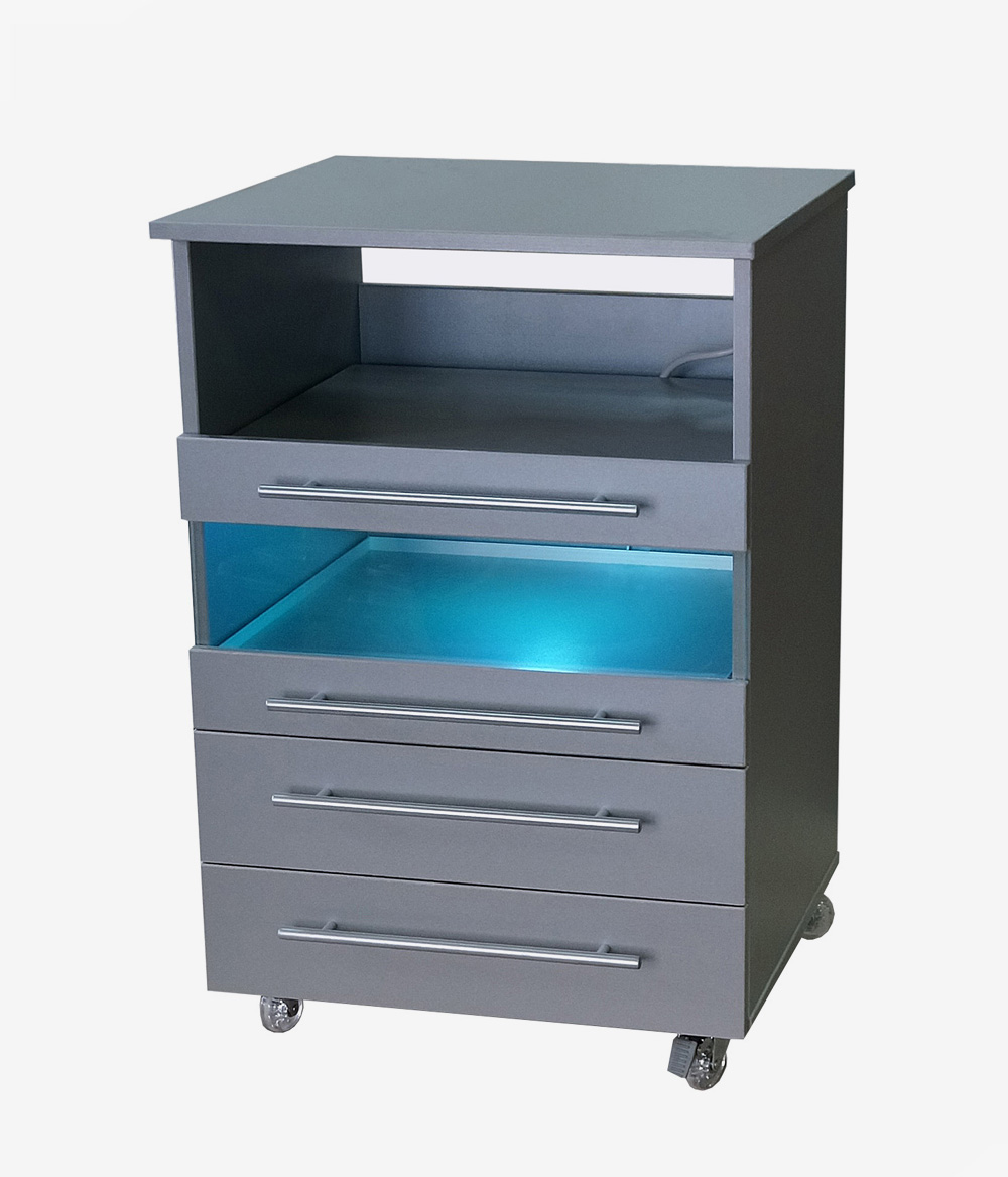УФ-модуль для стерильного хранение инструментов с бактерицидной лампой мощностью 11 Вт автоматически включается при закрытии ящика за счёт магнитного поля, что исключает доступ к контактам сети 230 Вольт. - Функциональные выдвижные ящики